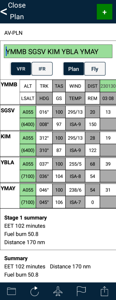 Note: All fields that appear within the flight plan table shaded green denote either the ability to add data to that cell, or to edit the automatically generated data placed in the cell by AvPlan EFB.