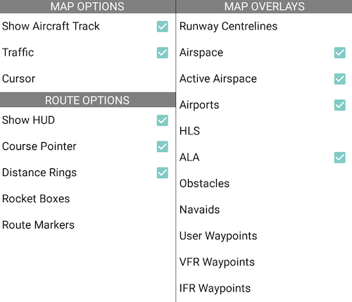 Map Settings menu- Map Overlays includes the following items to be overlaid on any map: