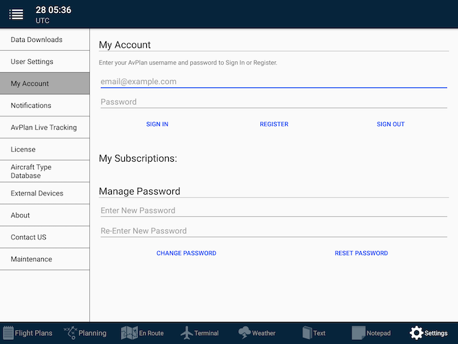 The My Account page allows you to link the app to the AvPlan Cloud server, which allows syncing of subscription details. You use login details to sign up with your email address and nominate a password or to sign in (if you’ve previously registered).