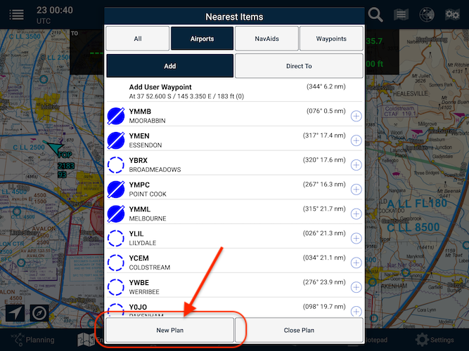 On the Enroute tab, tap the map and tap the New Plan button at the bottom of the Nearest Items menu.