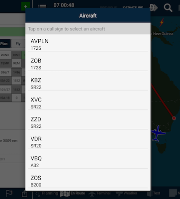 Select callsign menuTap on a callsign to select it. That aircraft’s performance details will then be applied to the flight plan and a recalculation will be performed.