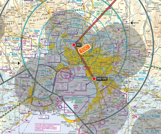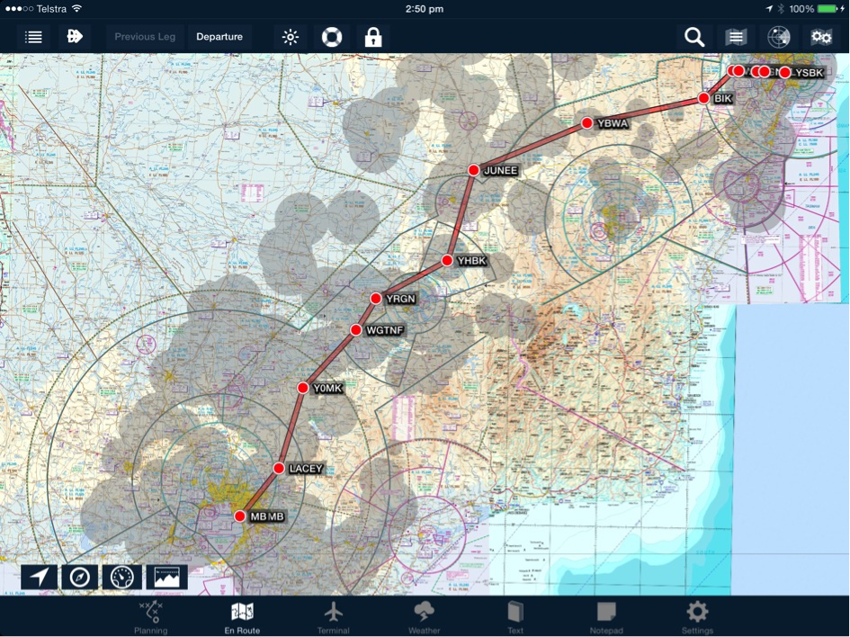 Displaying the glide envelopes within range or almost within range of a proposed flight path allows the pilot to maximize in-flight safety from a glide perspective. In the following screen capture the proposed flight plan from YMMB to YSBK has been modified to maximize the period of flight within glide range of an airfield.