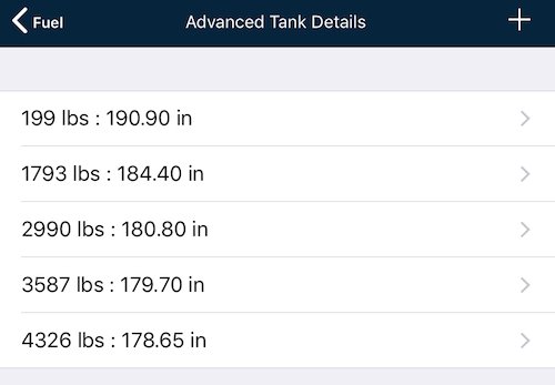 Advanced fuel tank arms can also be added. These allow different moment arms for different fuel levels (e.g. for swept-wing aircraft, or those with an unusually-shaped fuel tank system). Moment arms are linearly interpolated between values in the table. Only use this option if you are given an advanced fuel burn arm table in the POH.