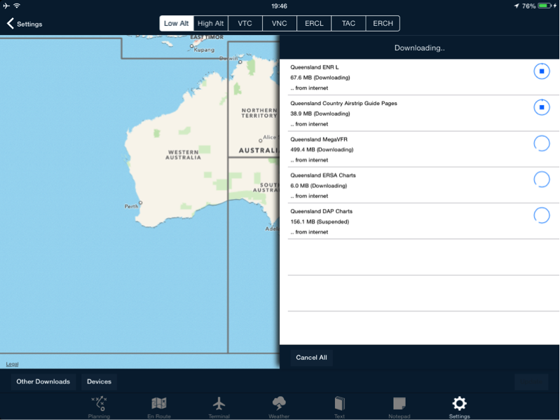 Australian users using AvPlan for the first timel need to choose what data areas you wish to download as described below. Navigation data, ERSA and AIP pages, and DAP charts (for Premium subscribers) will then automatically download for the selected areas according to your subscription level. The situation in NZ its simpler as there is far less data involved; you don’t have to choose a data area- you will get all of the NZ data that applies to your subscription level.