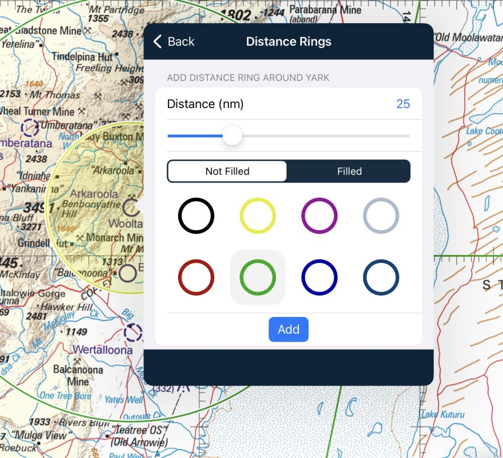 - Tap on Add to add the ring. The distance ring will be drawn and will remain on your chart until deleted.