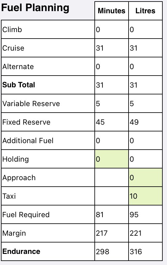 Fuel Planning TableWithin the fuel planning table, there are several fields where the details can be entered or amended.