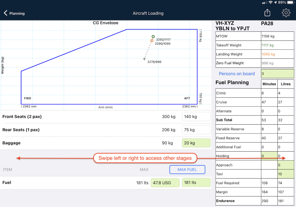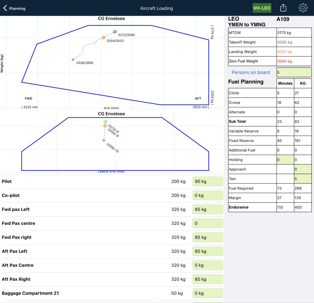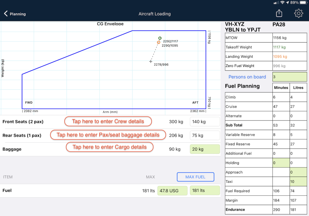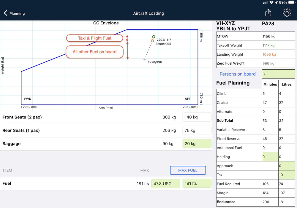 With weights entered, within the Centre of Gravity envelope should appear two small circles, a grey + symbol and dotted line connecting them.  If you don’t see that, there may be some important data missing from your aircraft profile.  Visit the Aircraft Type Database or tap the settings (cog) icon at the top right corner to enter those details.