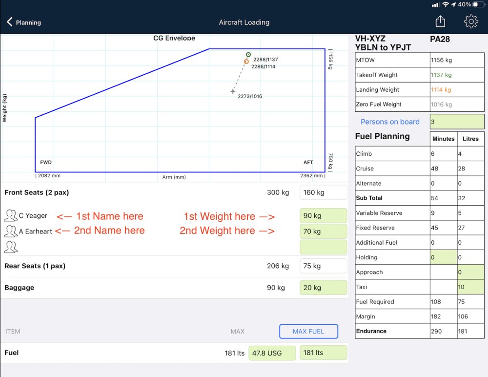 For subsequent crew and passengers, repeat the above process in an empty line in the appropriate load station line. Each time you enter a new passenger, both the Persons on Board field and the total weight for that load station will be updated accordingly.