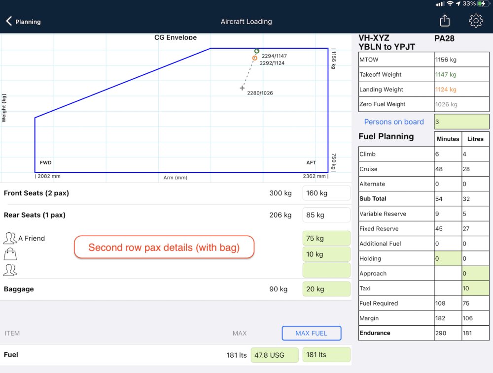- If baggage is loaded onto a passenger seat and you need this to show correctly in the passenger manifest, tap on the pax symbol