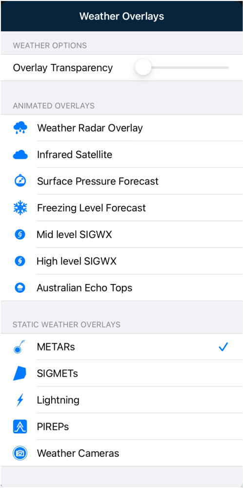 Only one Animated Overlay can be active at one time, whereas multiple Static Weather Overlays can be selected at the same time. Once selected, the static overlays selection will be stored and displayed next time AvPlan EFB is launched.