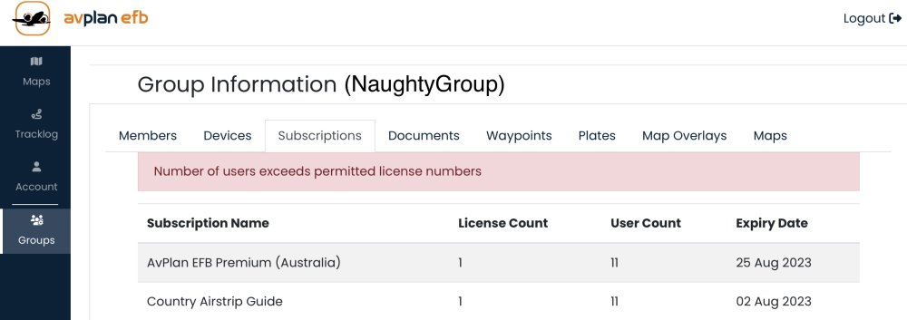 | Subscriptions | Shows the names of subscriptions associated with the group, the number of licenses associated with each, the number being actively used and the expiry dates. In this example the number of users exceeds the number of licenses. An appropriate warning is given. When this happens you may need more licenses to continue operating. |