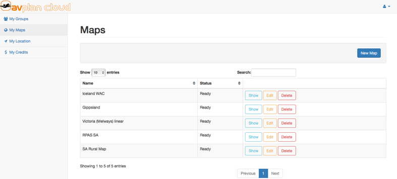 User maps are created and managed via the My Maps option on the AvPlan Cloud options list. Simply tap on the list option to display your current maps. From the list displayed you can review, add, modify and delete your map data.