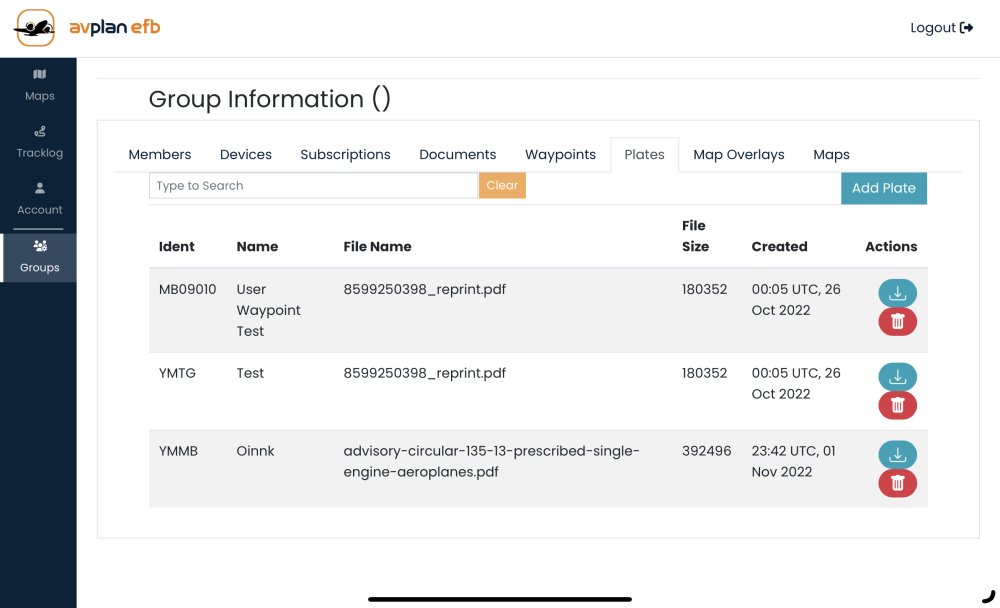 | Plates | Shows a list of group plates, if any have been loaded, with tools to add new ones and delete old ones. The Identifier , Plate Name, File name, File size and creation date are shown |