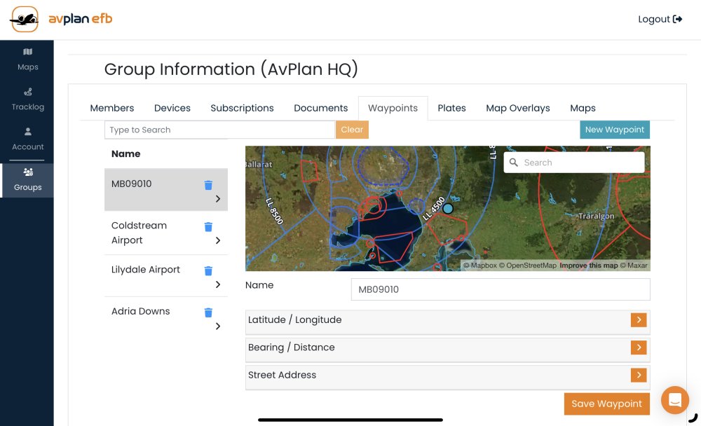 | Waypoints |  Shows a  list of group waypoints, if any have been created, with tools to add new ones and delete old ones. Selecting one will show where it is on a zoomable map. Hint- the easiest methods to add a new waypoint are by either specifying Lat and Long or by typing an address into the Search box on the map. The other methods work, but can be tricky to get exactly right.    |