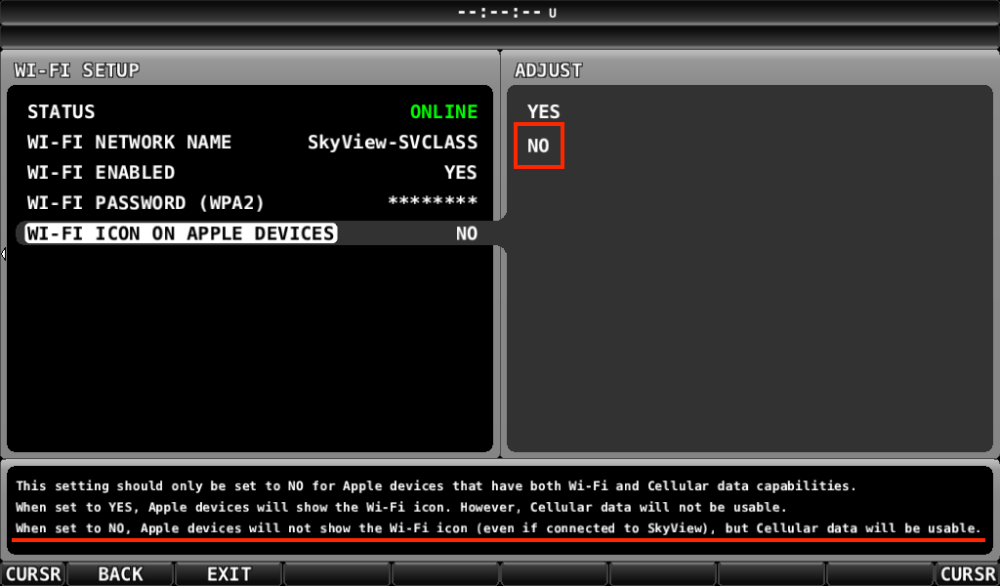 By default, when your iPad is connected to the Dynon Wi-Fi, the iPad will try to access the internet via the SkyView Wi-Fi connection – which is not possible. To resolve this issue, follow the steps below on your SkyView device to configure the SkyView network so it does not act as an internet end-point (assumes latest SkyView software version).