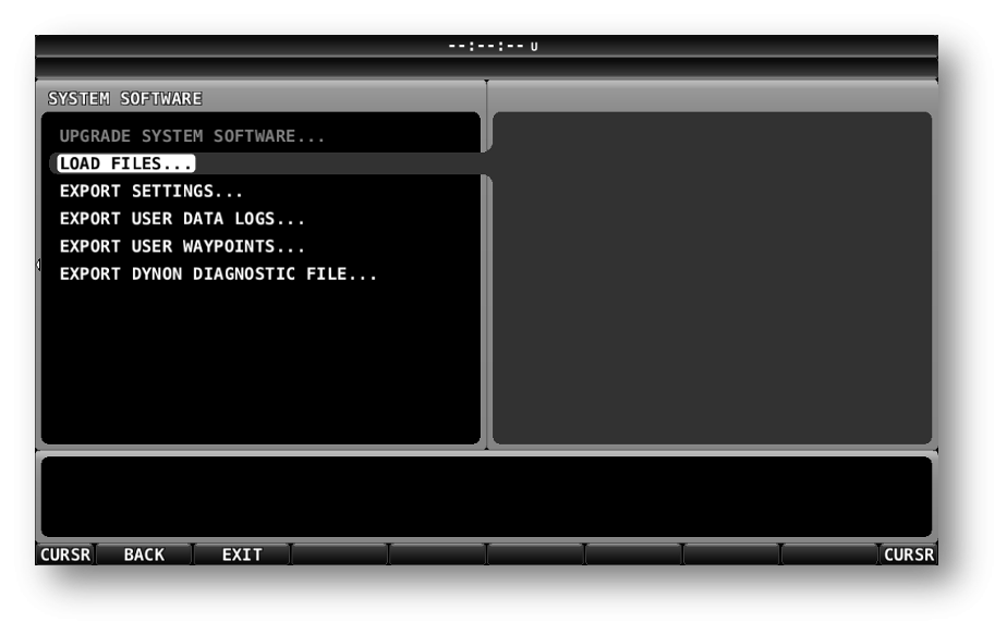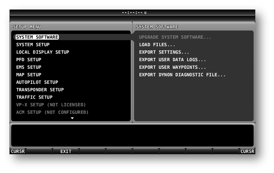 Figure 3 - SYSTEM SOFTWARE menu and optionsThe SkyView will only display files that conform to Dynon’s proprietary specification. Therefore the file list will only contain SkyView files newly or previously downloaded to the inserted USB device. The naming convention for the files is detailed in the following table: