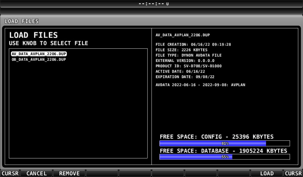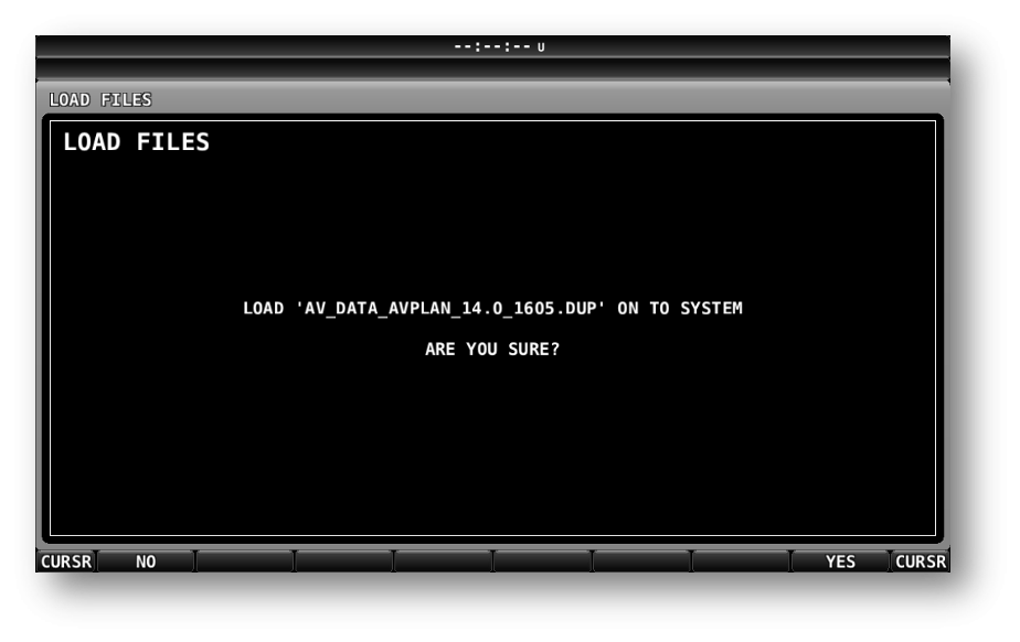 The databases are loaded one by one, but in no particular order. To load a database, scroll down to the database file using the right or left-hand knobs on the SkyView panel and once highlighted, select the database by pulling right on the knob. The SkyView will then prompt you to confirm the database load (Figure 5). To confirm the database load press the panel YES button on the bottom right of the panel else to go back to the LOAD FILES menu press the panel NO button in the bottom left of the panel.